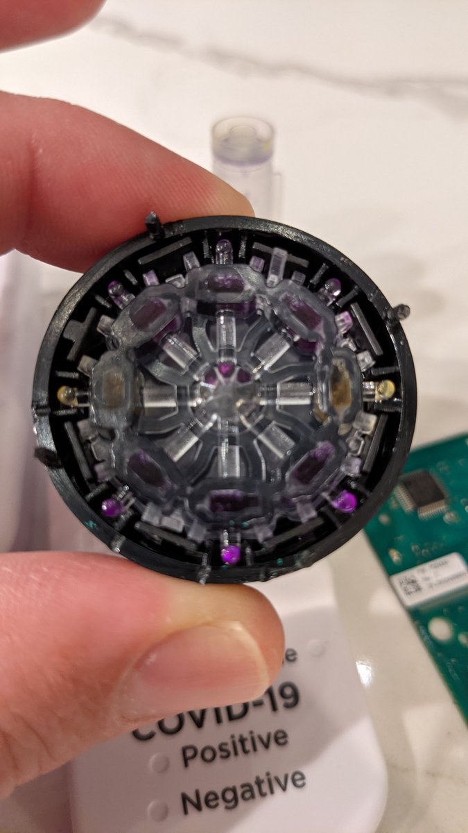 This is a Check-It (https://www.lucirahealth.com/) RT-LAMP device. Looks like 8 wells (only 6 illuminated), 2 positive controls and a CCD sensor for taking a photo of the colorimetric reaction. Seems so wasteful to be disposable but super cool!